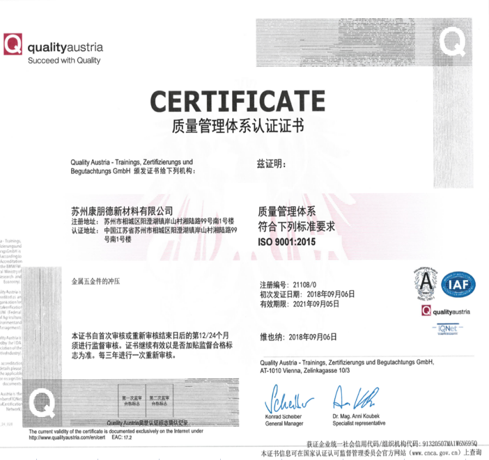 為了更好的使產(chǎn)品質(zhì)量得到控制,使顧客更加滿意,內(nèi)部管理水平得以提升,降低企業(yè)的管理成本并提高公司的工作效率,蘇州康朋德大力在內(nèi)部推行ISO體系,讓公司管理更加系統(tǒng)和規(guī)范。并于2018年9月6日取得了認(rèn)證。